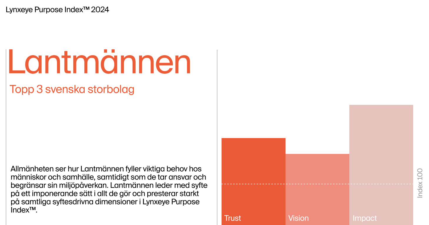 Förstaplaceringen i årets Lynxeye Purpose Index motiveras med att ”allmänheten ser hur Lantmännen fyller viktiga behov hos människor och samhälle, samtidigt som de också anses ansvarsfulla. Lantmännen är mest syftesdrivna både enligt åldersgruppen 18–35 och 55–65, en förankring som få företag lyckas med. De presterar också mkt jämnt på alla tre syftesdimensioner, det vill säga de är mycket trovärdiga, mycket visionära och har stor impact.”